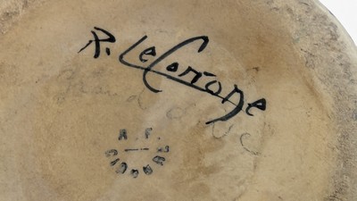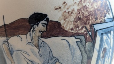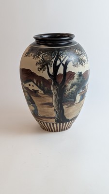 GRAND VASE bursiforme en grès émaillé polychrome à décor tournant d'un bouvier et femme avec pegarra à la fontaine, dans un décor de village basque. Signé R. Le Corrone et marqué au tampon.