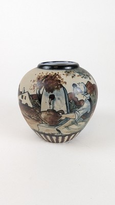 VASE boule en grès émaillé polychrome à décor d'une bergère à la fontaine.