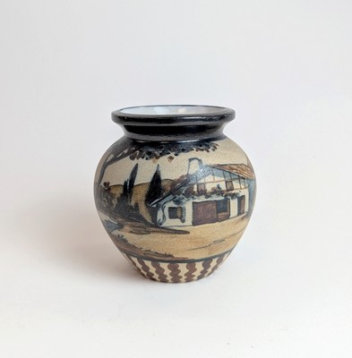 PETIT VASE balustre à col, en grès émaillé polychrome à décor d'une paysanne au panier avec sa mule sur fond de paysage basque. Marqué RF au tampon et signé Garcia.