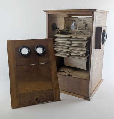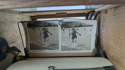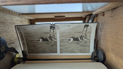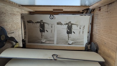 [BIARRITZ 1900] - VISIONNEUSE stéréoscopique en chêne et 26 PLANCHES PHOTOGRAPHIQUES stéréoscopiques représentant des vues des plages de Biarritz, baigneuses, jeux de plage, le palais, le casino mauresque et le casino Bellevue, rocher de la Vierge, le Basta, l'église Sainte Eugénie, etc.