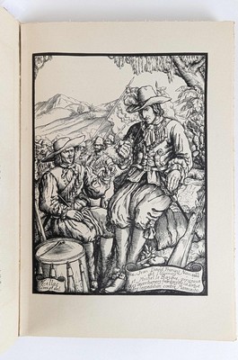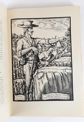 In-4 broché sous boîtage. Ouvrage illustré de 28 gravures sur bois en noir à pleine page et de 116 vignettes et bandeaux en rouge et noir de Pablo TILLAC. Ex. 607/1000 sur bouffant...
