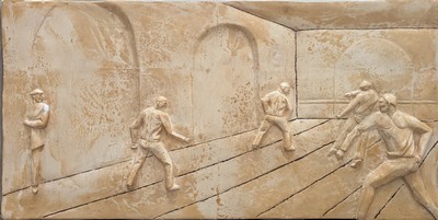 Epreuve en plâtre patiné représentant des joueurs de pelote basque.
