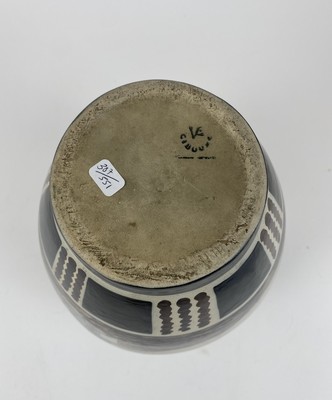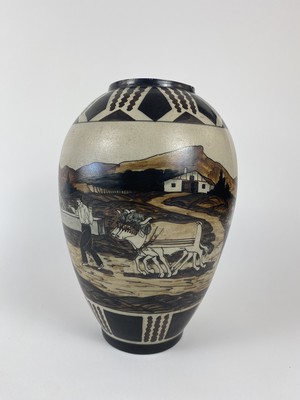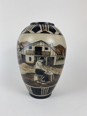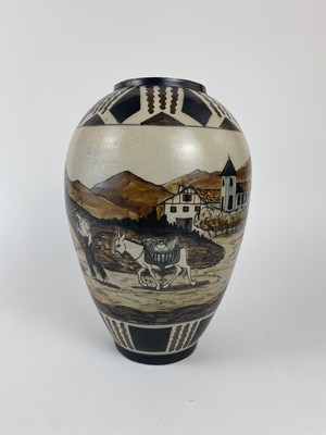 GRAND VASE ovoïde à décor tournant de sandalier, bouvier et muletier, dans un paysage de village basque. Marqué au tampon. Vers 1940.