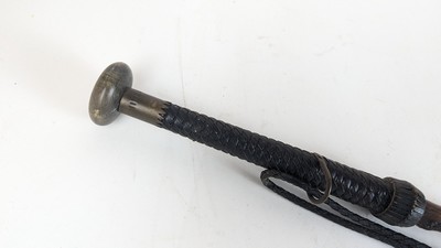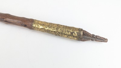 MAKILA en néflier, prise dévissable en cuir noir tressé et bouton en corne souligné de la devise "Hitza hitz", monture en laiton gravé de motifs géométriques. Signé.