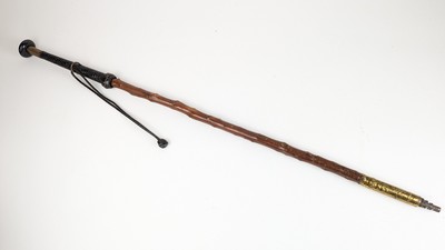 Pommeau en corne teinté. Prise et dragonne en cuir tressé. Signé.