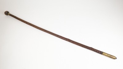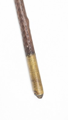 BÂTON DE MARCHE en néflier scarifié à monture en laiton gravé. Pommeau en corne blonde. Anneau de dragonne en laiton doré. (Fentes)