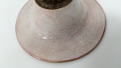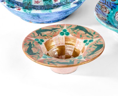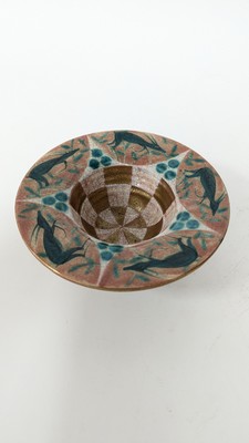 COUPE circulaire en faïence émaillée à décor sur l'aile d'antilope et branchage en vert sur fond orangé dans des réserves alternées de trois points, le bassin creux en damier or et blanc.