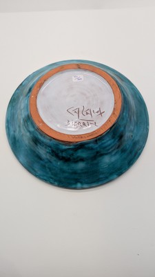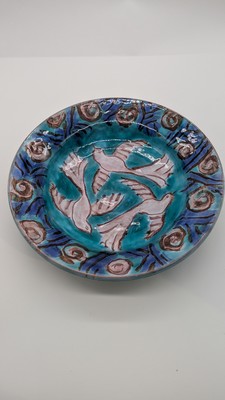 COUPE creuse circulaire en faïence émaillée polychrome à décor dans le bassin de trois oiseaux en blanc sur fond turquoise, aile à frise de fleurs et feuillage stylisés. Signée sous la base.