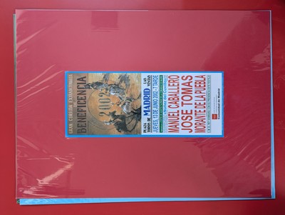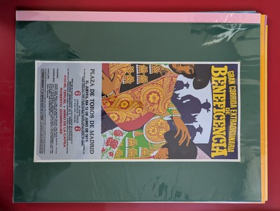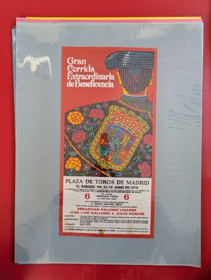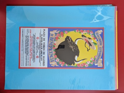 ENSEMBLE DES 69 AFFICHES lithographiées en couleurs de la plaza de toros de Séville sur les 69 dernières années, comprenant en partie haute la réproduction d'oeuvres de tauromachie et en partie basse les Corridas, leurs toreros et matadores.