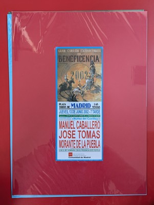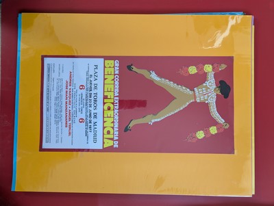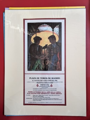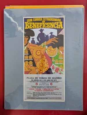 ENSEMBLE DES 69 AFFICHES lithographiées en couleurs de la plaza de toros de Séville sur les 69 dernières années, comprenant en partie haute la réproduction d'oeuvres de tauromachie et en partie basse les Corridas, leurs toreros et matadores.