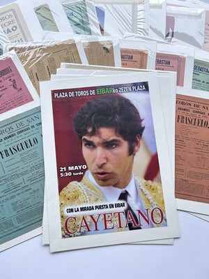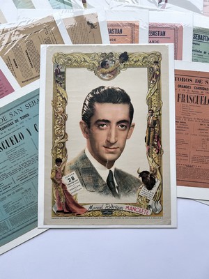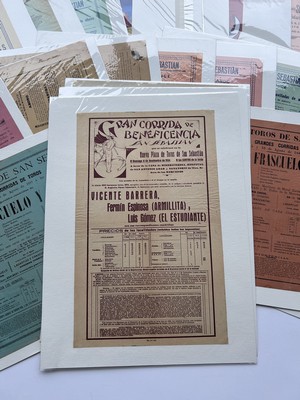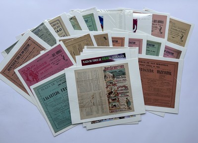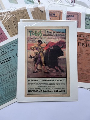 TRES IMPORTANT ENSEMBLE DE 83 AFFICHES lithographiées, placard, billets et reproductions sur les Corridas de Bilbao, San Sébastien, et de Jerez de 1885 à 2010, dont une lthographie de toros et fiestas de San sebastien, imprimeur Romillo, six affiches contemporaines...