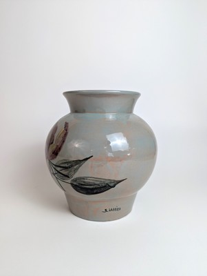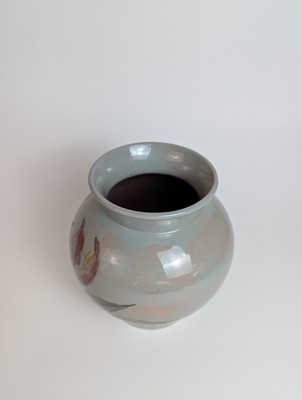 GRAND VASE pansu en faïence émaillée, à décor d'un bouquet de fleurs et feuillage polychromes, sur fond bleu-gris. Signé.