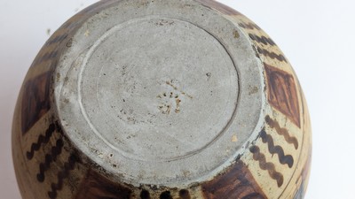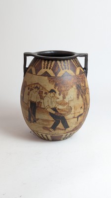 GRAND VASE bursiforme à anses droites en grès émaillé à décor tournant de pelotari au fronton d'un village basque avec porteuse de pegarra. Intérieur noir. Marqué sous la base.