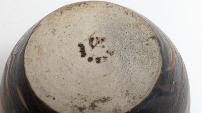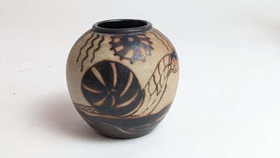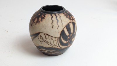 VASE boule en grès émaillé à décor tournant d'escargots et motifs géométriques au col. Intérieur noir. Marque sous la base.