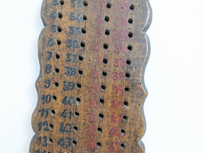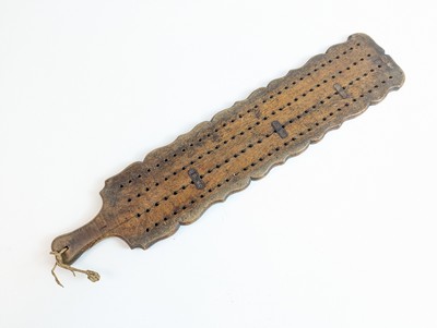 [PELOTE] - RARE COMPTEUR A POINTS de forme planche avec manche, en bois, à contour chantourné et 60 marques rouges et 60 marques bleues. Anciens renforts en fer.