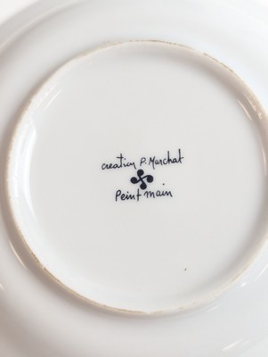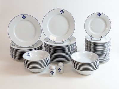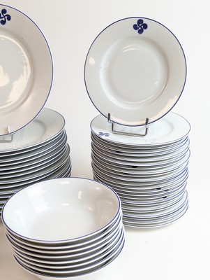 SERVICE DE TABLE en porcelaine blanche de Limoges, émaillée à la main par P. Marchat, à décor de croix basque et filets bleus, comprenant 70 pièces, soit :