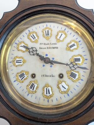 PENDULE CARILLON A SUSPENDRE à cadran circulaire en marbre peint et cartouche pour les heures en laiton doré et ciselé d'acanthes. Signé Edouard Raymond à Saint-Jean-de-Luz - 1ère Qualité garantie. Cadre à abattant en bois mouluré et noirci.