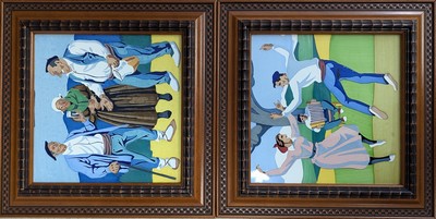 PAIRE DE CARREAUX en faïence émaillée polychrome, figurant une scène de fandango et de fête basque.