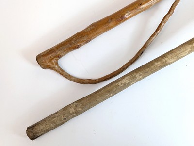 DEUX BRISE-CAILLÉS en bois, utilisés dans la fabrication du fromage de brebis.