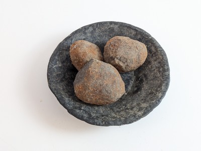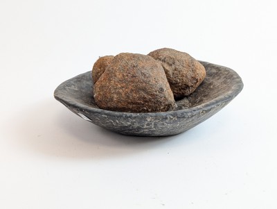 TROIS PIERRES ET COUPE EN PIERRE à chauffer pour transformer le lait et la présure pour cailler dans les kaiku. Ces pierres chauffées dans les cheminées brûlaient et noircissaient le fond des kaiku.
