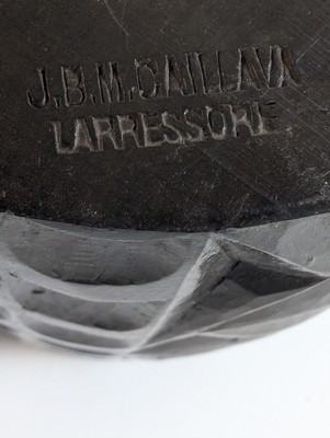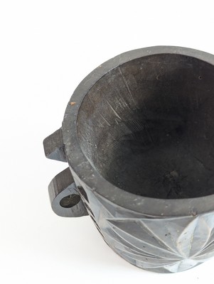 POT décoratif, monoxyle et sculpté de rosaces, modèle réduit des pots pour récupérer le petit-lait. Signé.