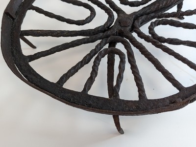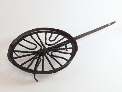 GRILLOIR A TALOA en fer forgé, de forme circulaire tournant, sur piétement tripode à long manche.