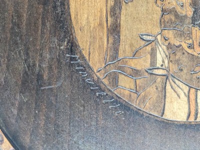 DESSOUS-DE-PLAT ou MÉDAILLON octogonal en bois sculpté et pyrogravé à décor de boeufs et ferme basque. Signé Minvielle.