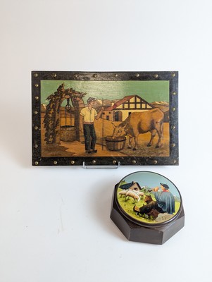 PANNEAU rectangulaire en bois pyrogravé et peint figurant un bouvier avec sa vache près d'un puit. Bordure à clous. Signé.