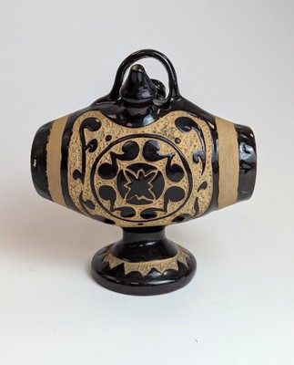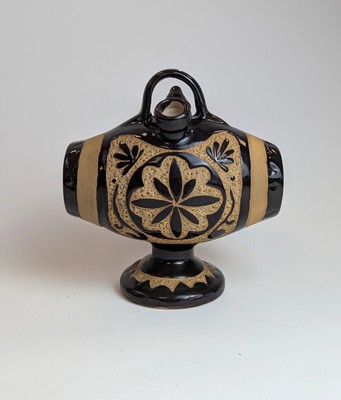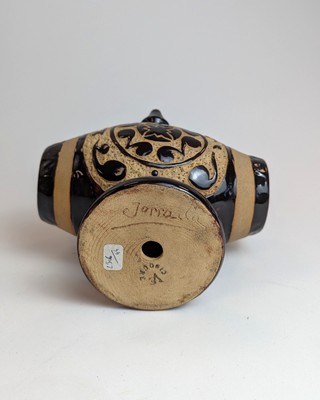 GARGOULETTE de forme tonneau en grès émaillé et sculpté à décor Jorraila. Marqué VF au tampon et gravé en creux.