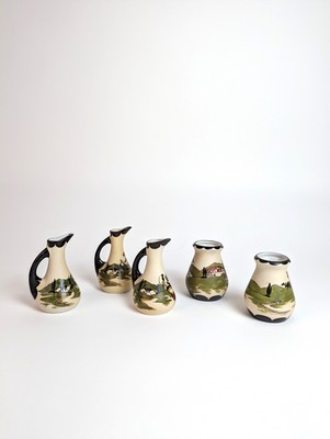 TROIS BURETTES et PAIRE DE PETITS VASES balustres en grès émaillé, à décor de basque à sa gourde, femme à la fontaine avec pegarra et danseurs de fandango.