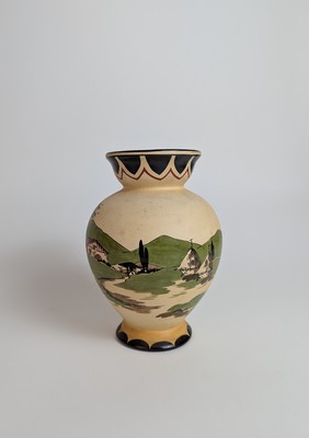 VASE balustre, en grès émaillé, à décor de danseurs basques avec zamalzain. Frise géométrique au col.