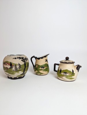 UNE THÉIERE, UN POT A LAIT et UN VASE boule, en grès émaillé, à décor de danseurs basques et paysan sur sa mule.