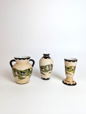DEUX VASES balustres dont un à anses et UN MAZAGRAN, en grès émaillé, à décor de femmes à la fontaine et paysan sur sa mule.