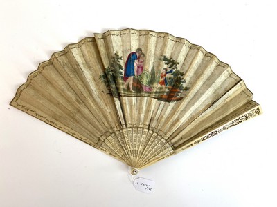 ÉVENTAIL plié, la feuille peinte à la gouache d'une scène réunissant un Empereur romain et une dame de qualité en compagnie de l’Amour.