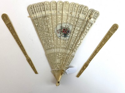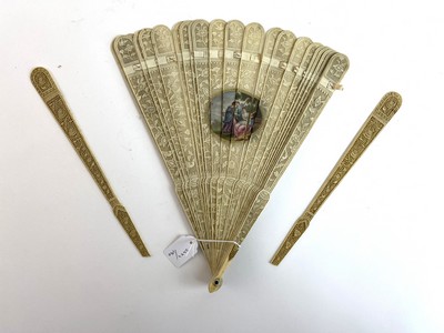 ÉVENTAIL de type brisé en ivoire finement repercé, sculpté et gravé d’un riche décor d’oiseaux dans un semis de fleurs. Au centre, un médaillon accueille trois femmes jouant de la musique, dans le goût d’Angelika Kauffmann.