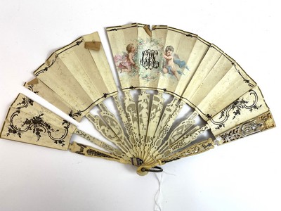 ÉVENTAIL plié, la feuille double en peau, peinte à la gouache d’enfants travestis en adultes. Habillé en moine, l’un d’eux invite un garçonnet à s’adresser à deux petites filles. Signé à gauche « Lièvre ».