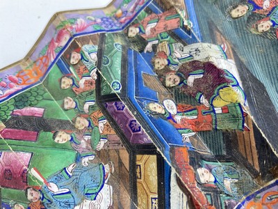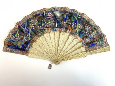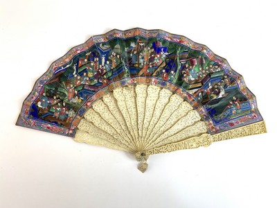 EVENTAIL plié, la feuille double en papier peinte à la gouache de 47 personnages sur les terrasses de palais. Tous portent des vêtements en soie en relief, et une tête appliquée.