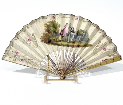 ÉVENTAIL de type plié en bronze à double feuille peinte à la gouache et rehaussée à l'or représentant le château Saint-Ange de Rome. Le revers à décor d'une scène champêtre figurant un père et ses enfants décorant un buste de guirlandes de fleurs. Les brins et panaches à décor ciselé ou ajouré de rinceaux sertis d'améthystes en cabochons...