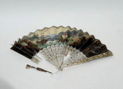 ÉVENTAIL de type plié en nacre à double feuille peinte à la gouache et rehaussée à l'or représentant Moïse et Aaron faisant jaillir les eaux du rocher pour le peuple d'Israël. Le revers à décor d'un paysage champêtre. Les brins et panaches à décor ajouré de semis de fleurs.