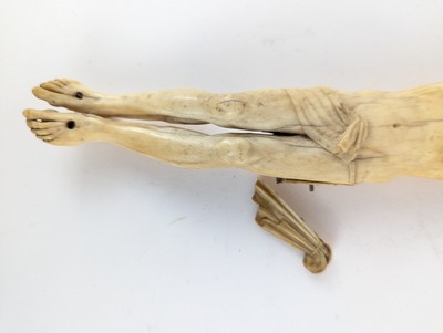CRUCIFIX avec Christ en ivoire sculpté, la tête tournée vers le ciel, périzonium avec chute sur la hanche droite et retenu par une cordelette.