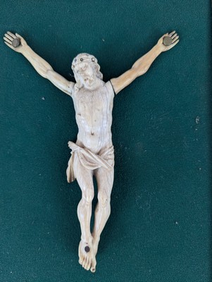 CHRIST en ivoire sculpté, la tête ceinte d'une couronne d'épines, inclinée sur l'épaule droite, périzonium noué avec chute sur la hanche droite, jambes fléchies et pieds superposés.