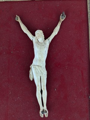CRUCIFIX avec Christ en ivoire sculpté, la tête tournée vers le ciel, perizonium avec chute sur la hanche droite et retenu par une cordelette.