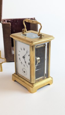PENDULE DE VOYAGE dite D’OFFICIER dans sa cage en bronze, cadran émaillé à deux compteurs.