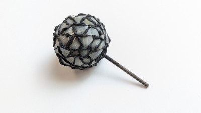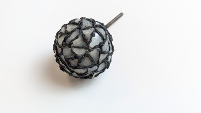 POIGNÉE DE PORTE ou POMMEAU DE CANNE globulaire en talosel noir incrusté de morceaux de verre filé blanc.