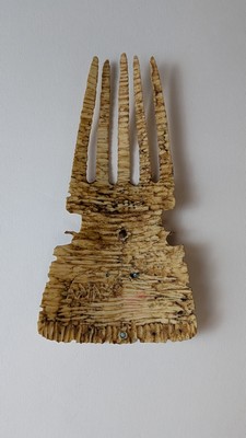 PEIGNE A CHEVEUX en talosel beige avec cabochons en pâte de verre rose et turquoise, strass bleus et petites pointes d'acier en guirlandes. Signé au revers.