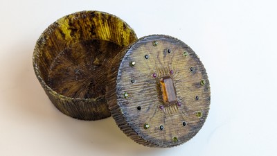 BOÎTE ronde en résine teintée brun à décor sur le couvercle de cabochons et strass orange, jaunes et noirs.