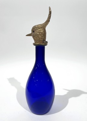 CARAFE en verre moulé soufflé et teinté bleu à monture en bronze doré et ciselé à décor d'une tête d'aigrette. Les yeux en sulfure.