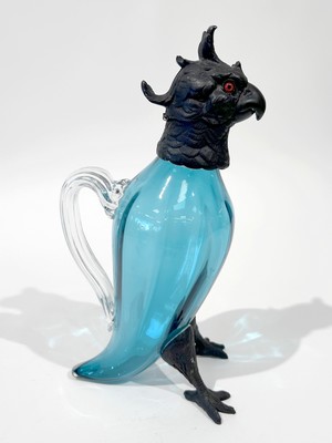 CARAFE A DÉCANTER en verre moulé soufflé et teinté bleu turquoise représentant un perroquet. Monture et pieds griffes en régule patiné. Yeux en sulfure. Le bec formant goulot.