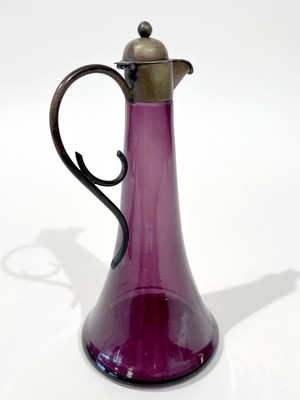 PETITE CARAFE en verre moulé soufflé et teinté violet à monture en laiton doré.
