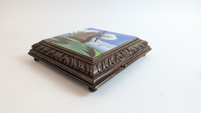 DESSOUS-DE-PLAT à musique de forme carrée en bois avec carreau de faïence à décor d'un moulin, et système d'arrêt. Reste d'étiquette Thibouville.